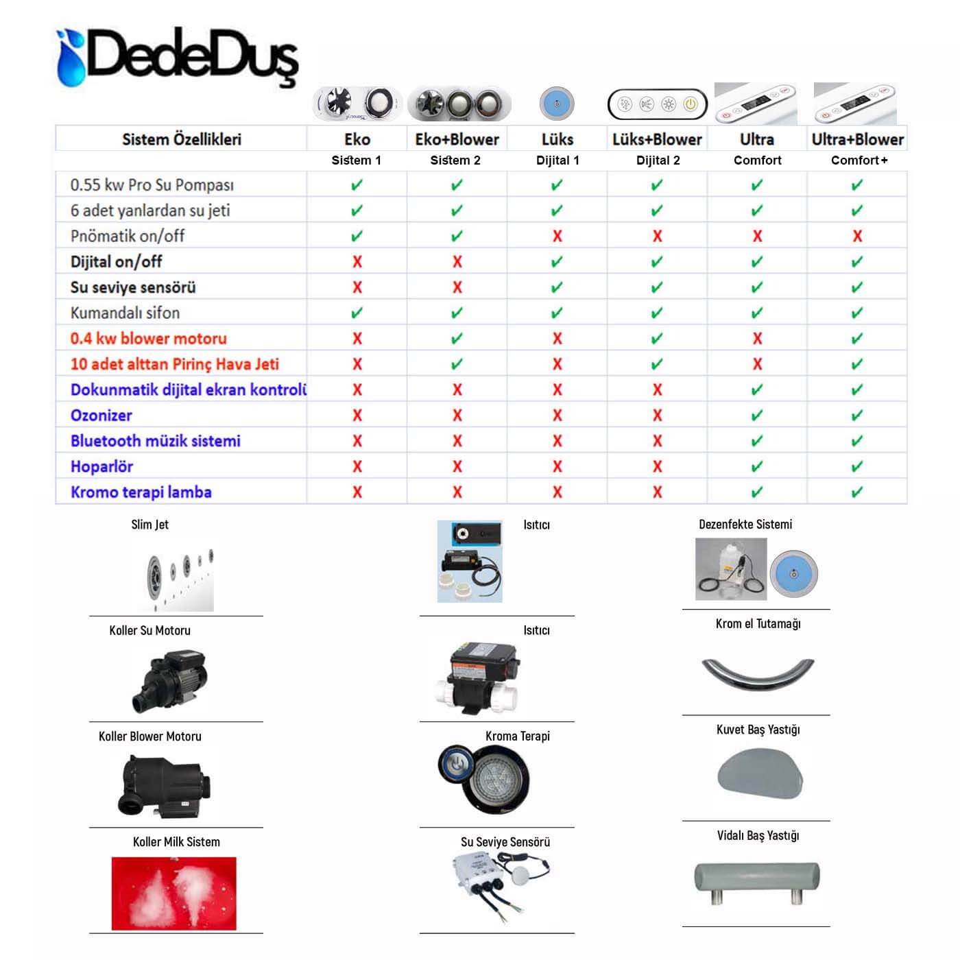 Kendinden renkli %100 Dökme Akrilik jakuzi küveti, Metal konstrüksiyon güçlendirme, Emiş süzgeci, Basınç ayar butonu, Kumandalı Sifon + System 1 Hidro Masaj Sistemi