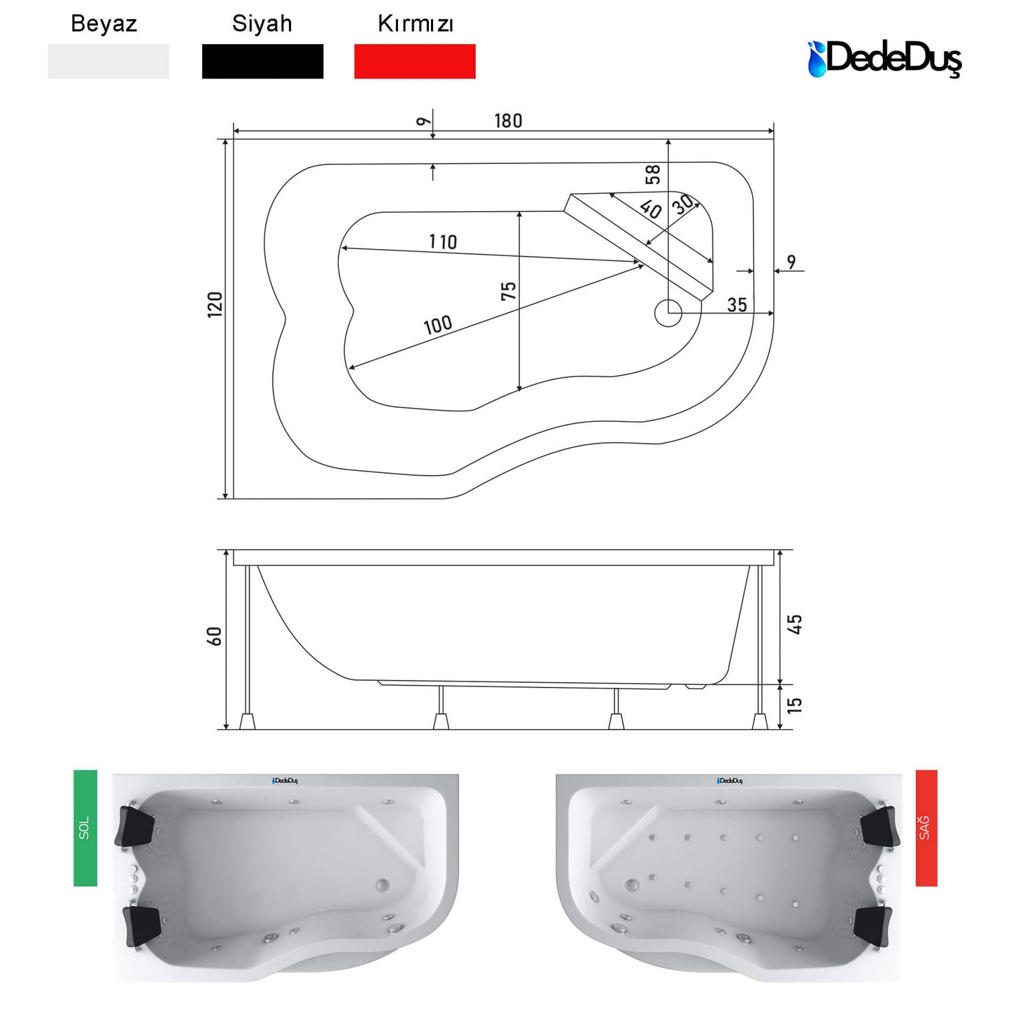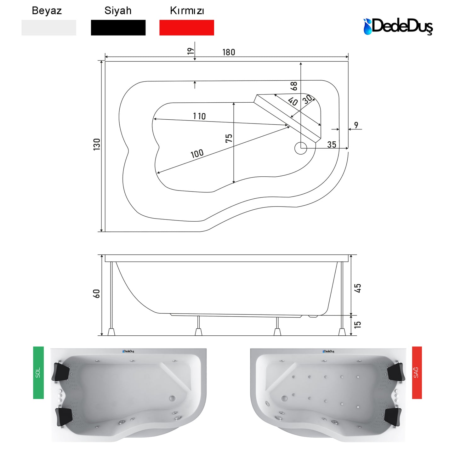 Renkli: Tüm jakuzi küvetlerimizi, siyah ve kırmızı renk olarak da (fiyat farkı ile) sipariş verebilirsiniz.