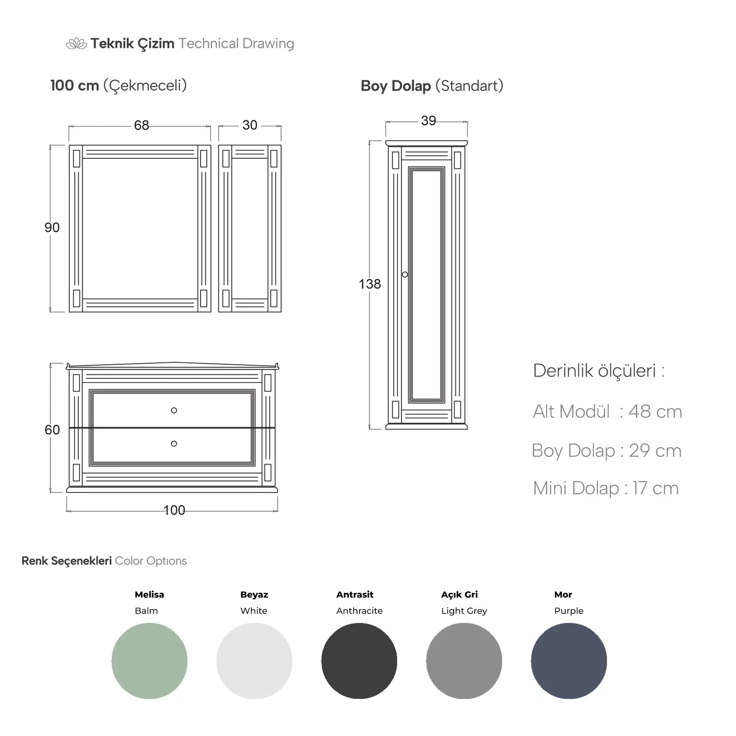 Shower Cristal 100 cm banyo mobilyası seti; Melisa, Beyaz, Antrasit, Açık Gri ve Mor olmak üzere 5 farklı modern renk seçeneğiyle banyo dekorasyonunuza uyum sağlar.