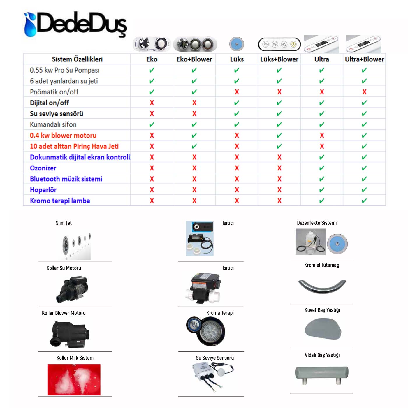 Kendinden renkli %100 Dökme Akrilik jakuzi küveti, Metal konstrüksiyon güçlendirme, Emiş süzgeci, Basınç ayar butonu, Kumandalı Sifon + System 1 Hidro Masaj Sistemi
