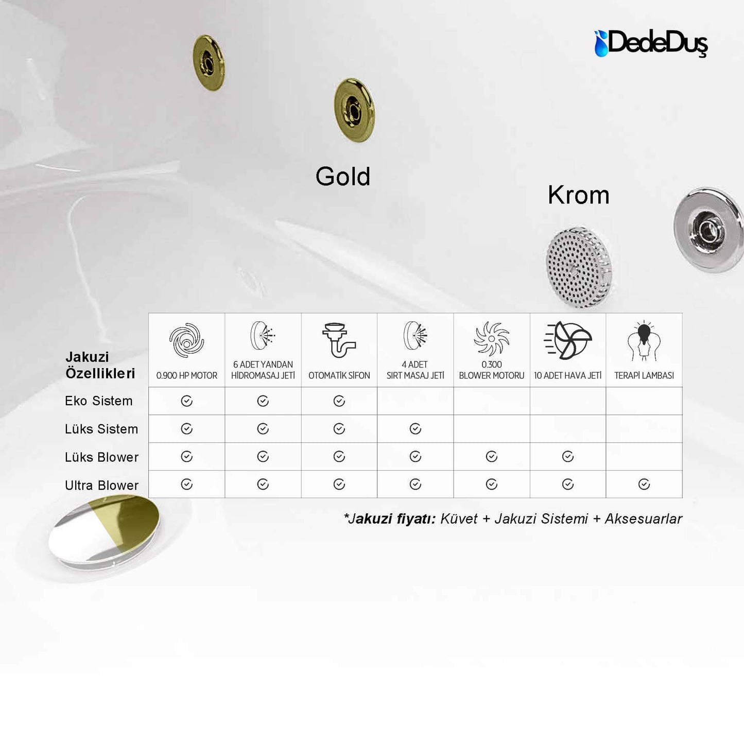* Hidromasaj sistemi (jakuzi) olmadan, boş küvet talepleriniz için lütfen iletişime geçiniz!