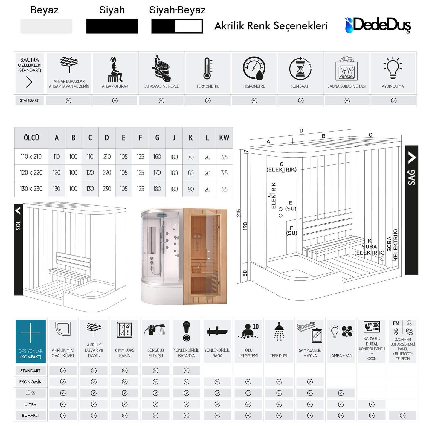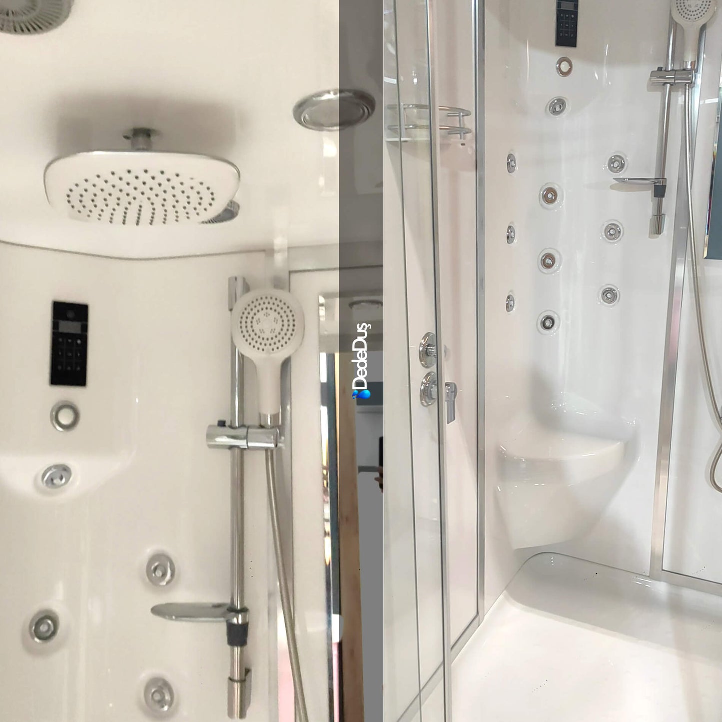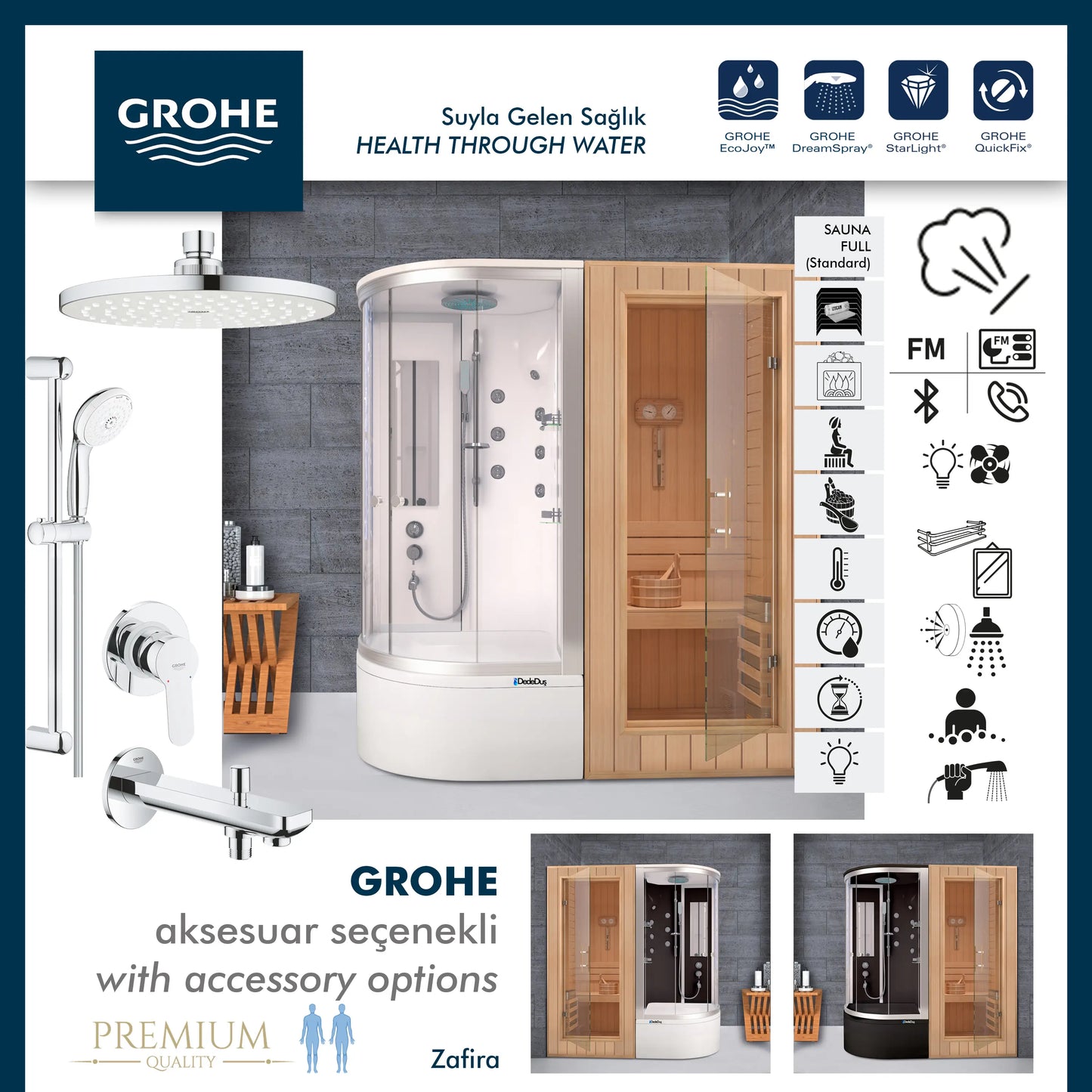 Sırt masajlı jet sistemi, Tepe Duşu, Şampuanlık, Ayna, Lamba, Havalandırma Fanı, FM Radyo, Ozon (Kabin temizleme), Dijital Kontrol Paneli, Telefona Bluetooth bağlantı (Müzikli), Buharlı Panel seçeneklerini kullanabilirsiniz!