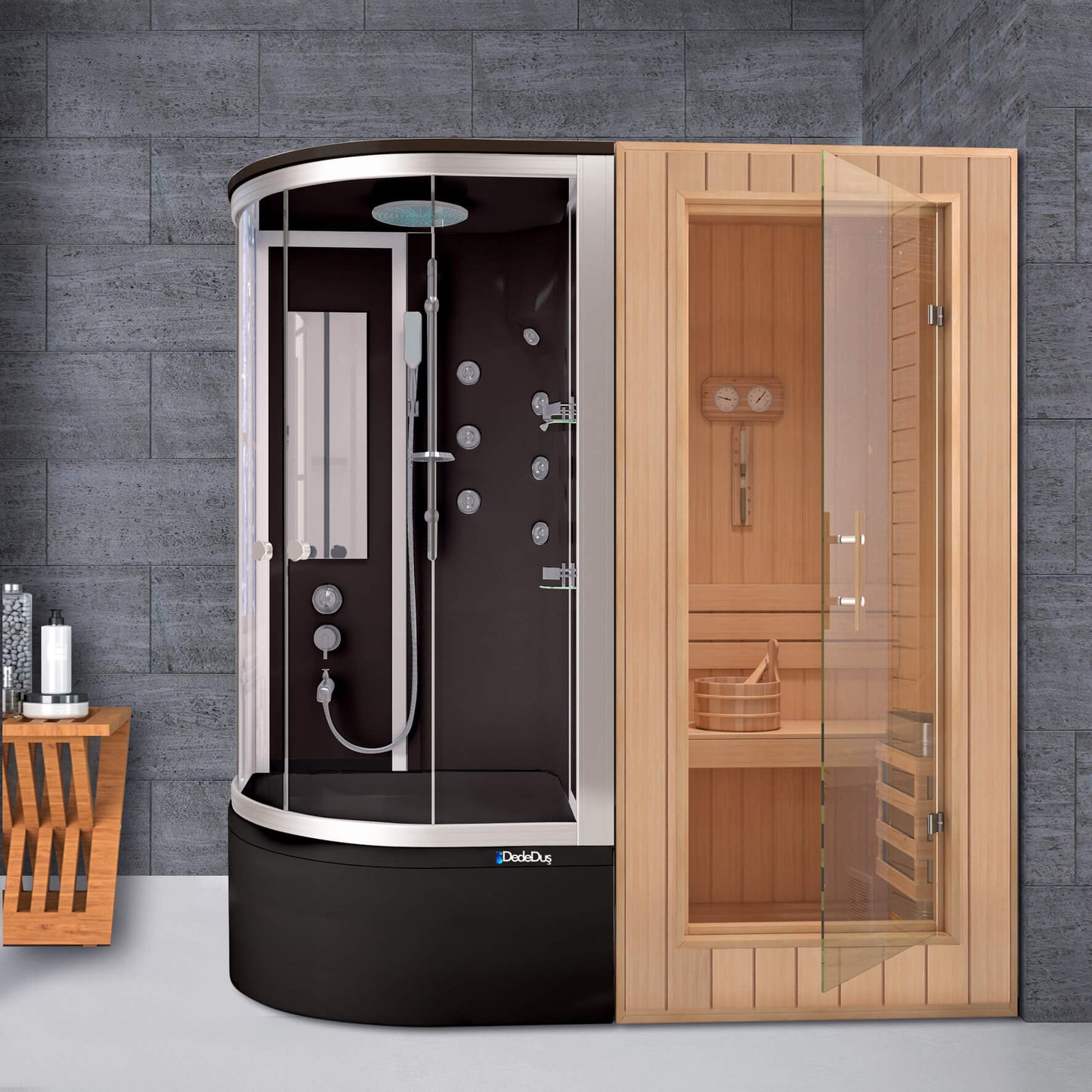 "Kompakte Sauna mit ovaler Badewanne | Modus" ürününde Sauna kısmı FULL standart olup, duş kabini kısmında: