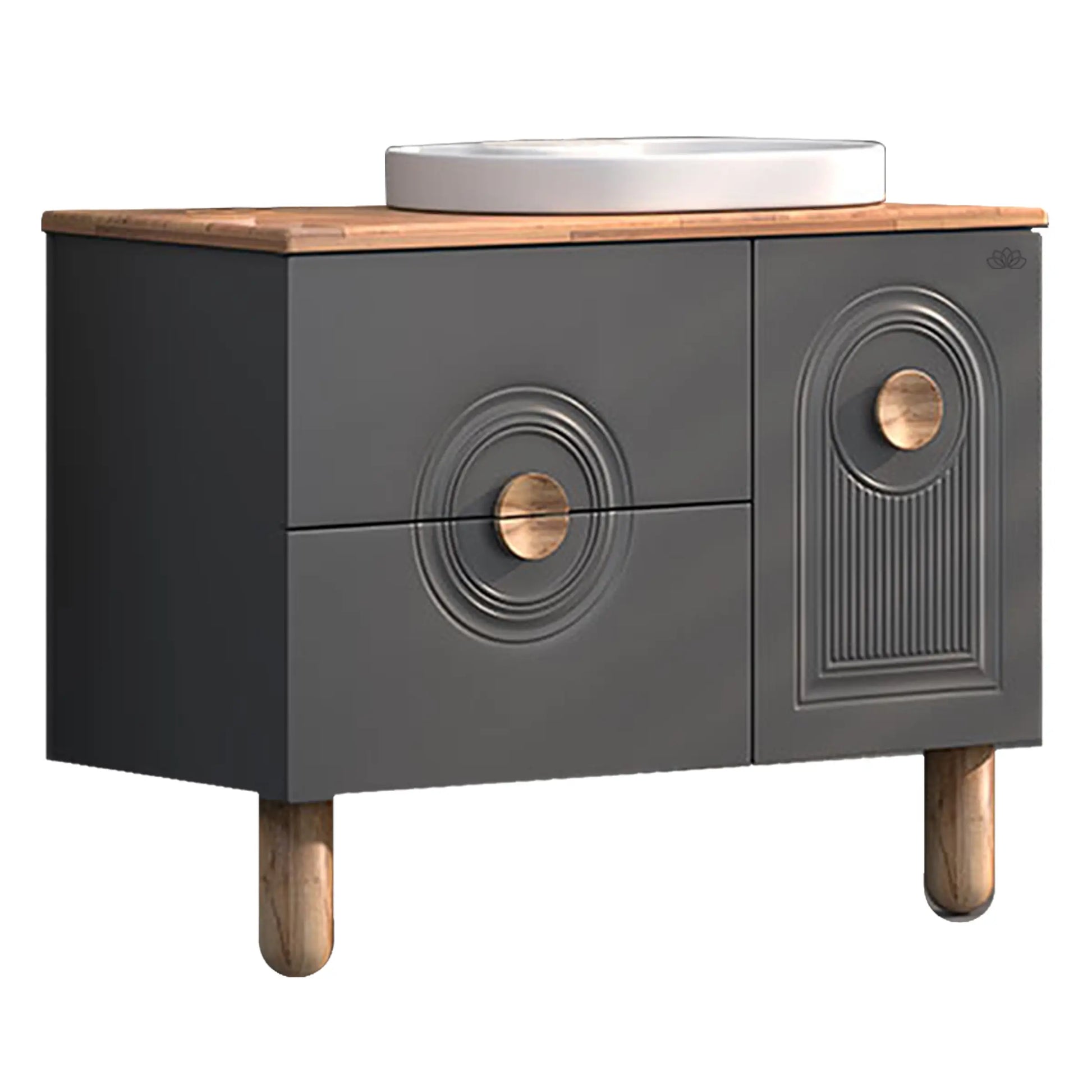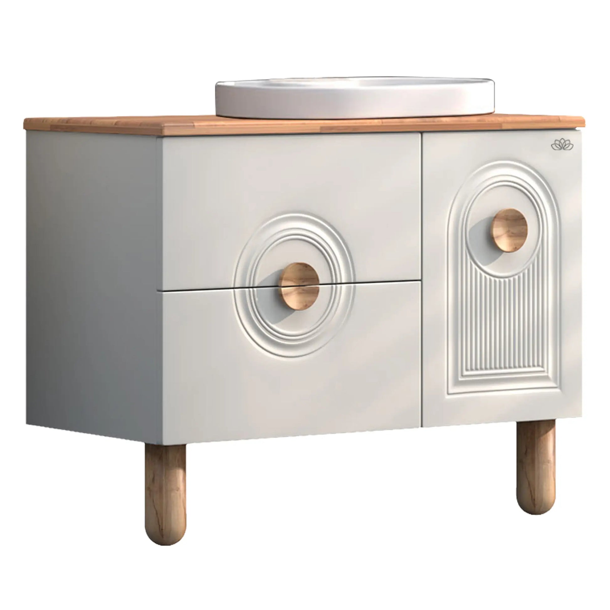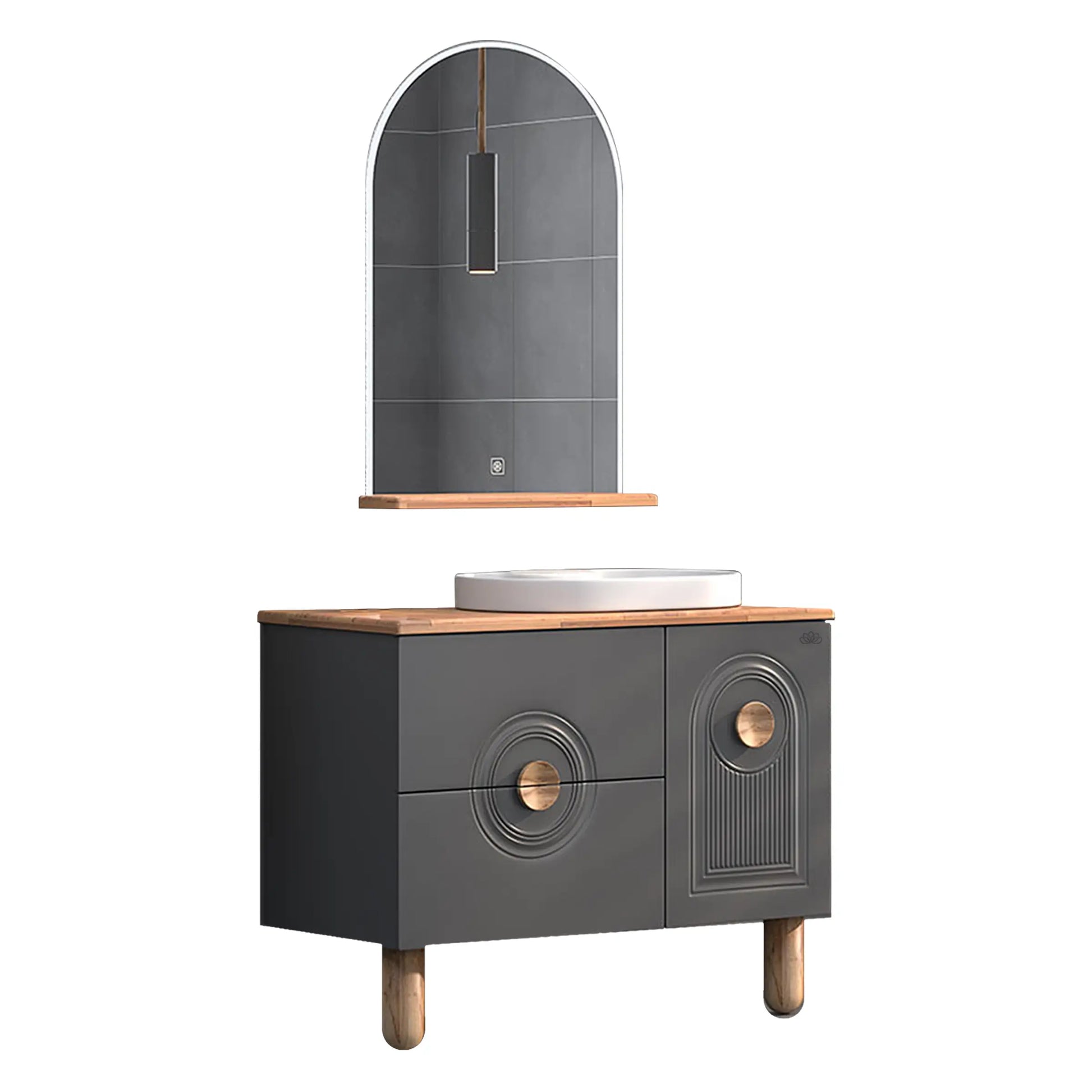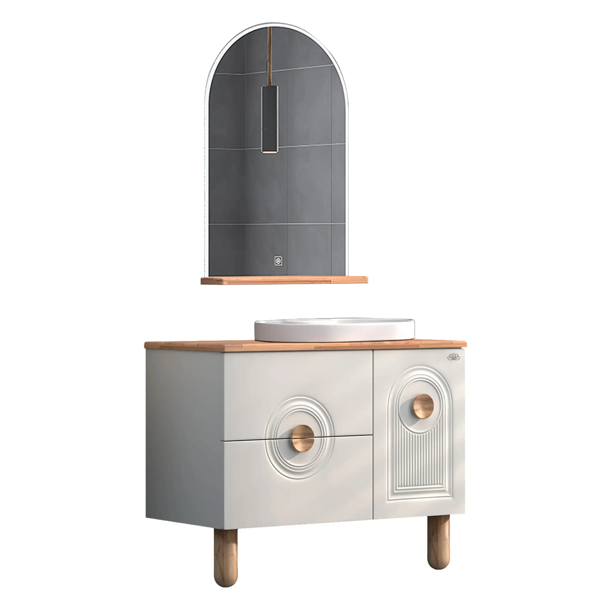 Arte 100 cm banyo mobilyası, banyonuza sıcak ve doğal bir dokunuş katıyor. Ahşap tezgahı, kulp ve ayak detaylarıyla öne çıkan bu şık takım, hem modern hem de klasik banyo dekorasyonlarına uyum sağlıyor.