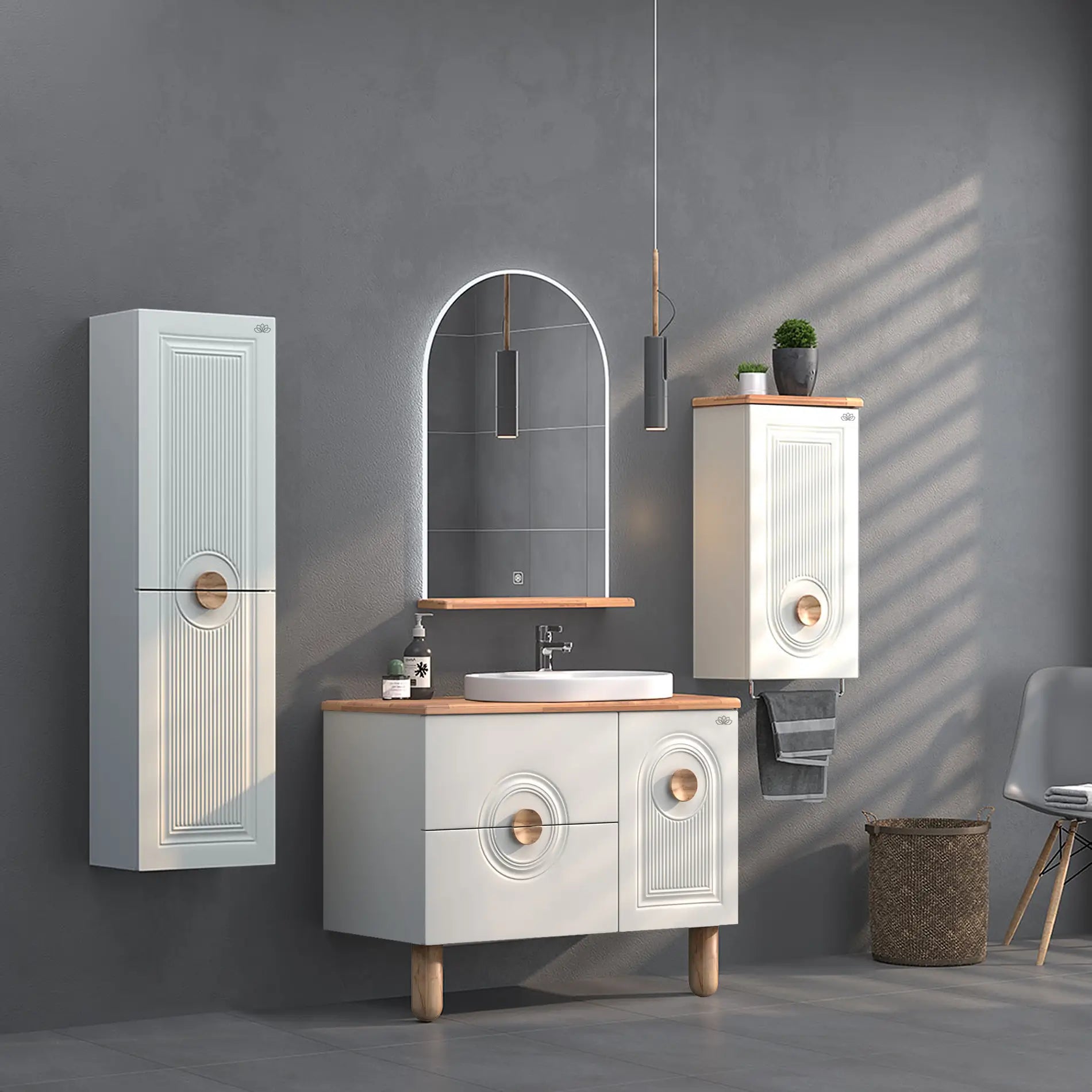 Arte 100cm Banyo Mobilyası | Ahşap Tezgahlı, Led Aynalı, Boy Dolaplı