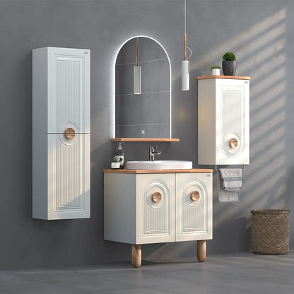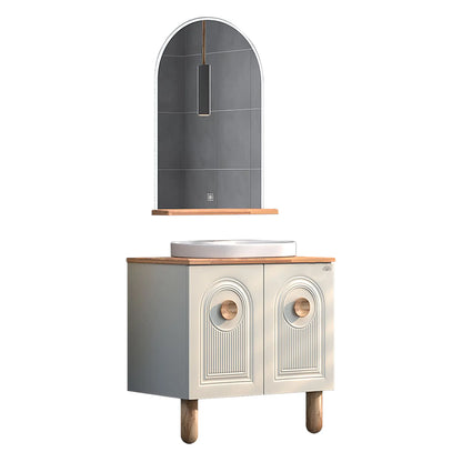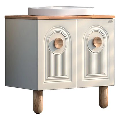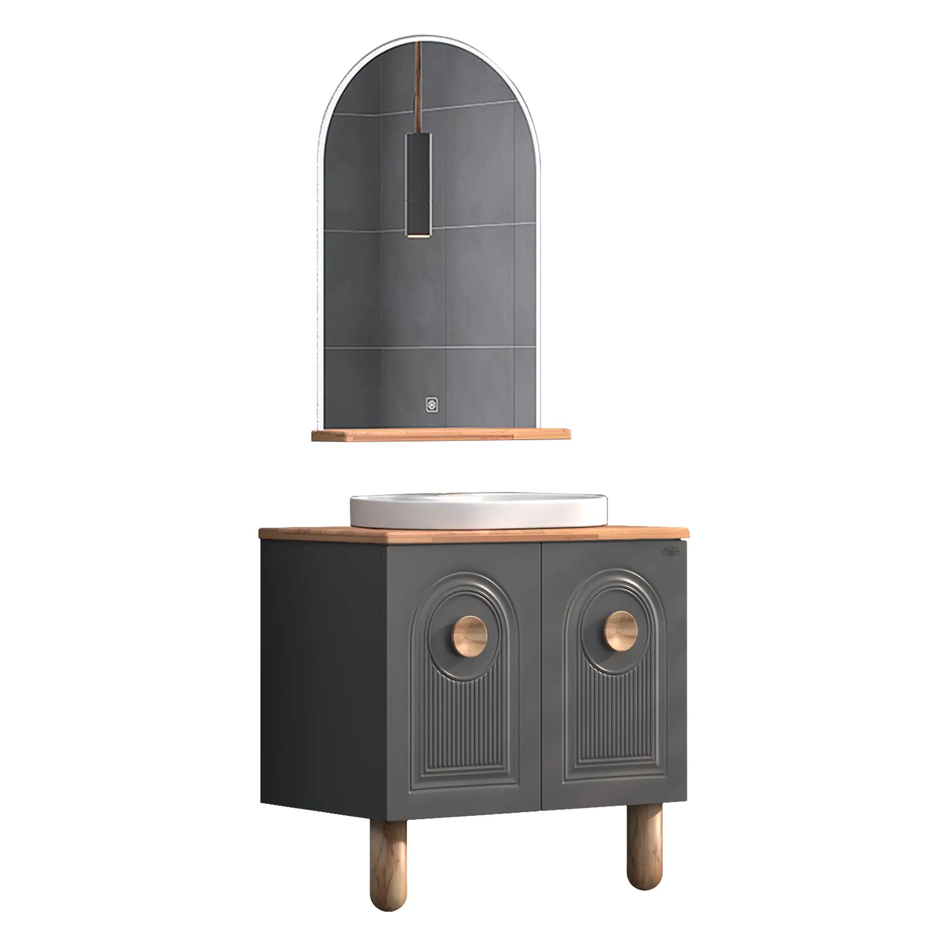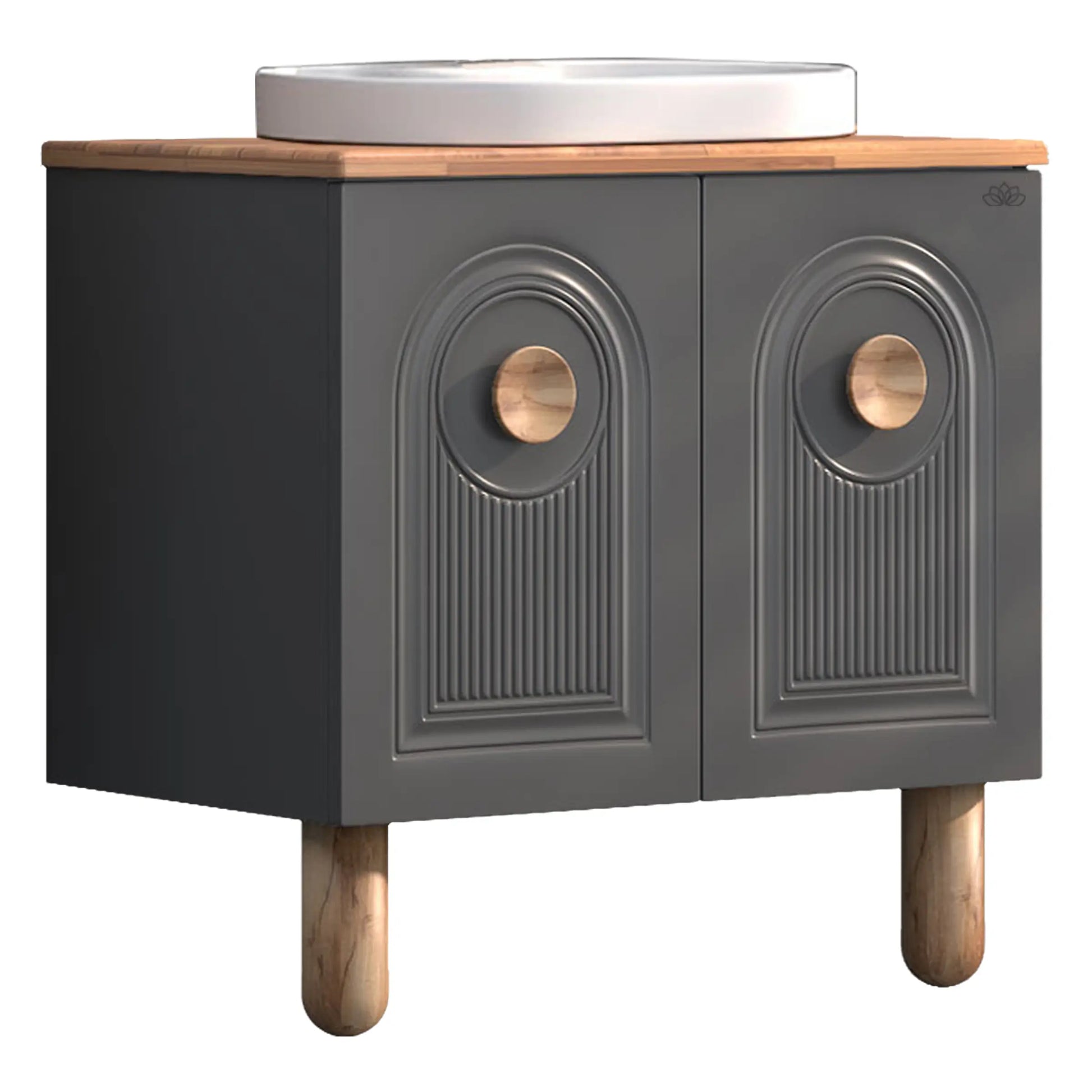 Arte 80 cm banyo mobilyası, sınırlı alanlara sahip banyolara sıcaklık, doğallık ve şıklık katmak için tasarlandı. Ahşap tezgahı, kulp ve ayak detayları ile öne çıkan bu kompakt takım, hem fonksiyonel hem de estetik bir çözüm sunuyor.
