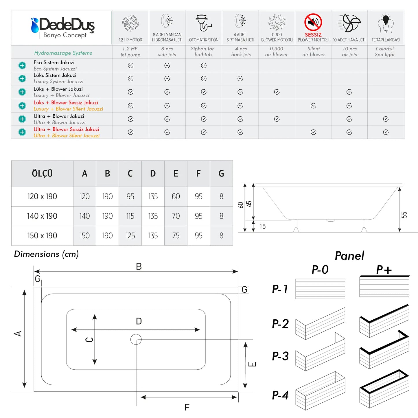 * Jakuzi sistem özelliklerinin, krom ve gold aksesuar seçenekleri de vardır.