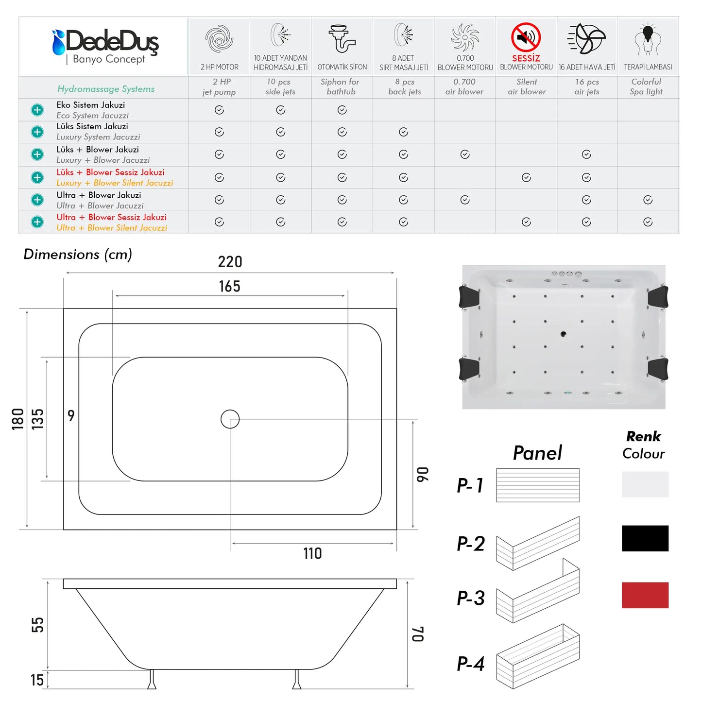 * Jakuzi sistem özelliklerinin, krom ve gold aksesuar seçenekleri de vardır.