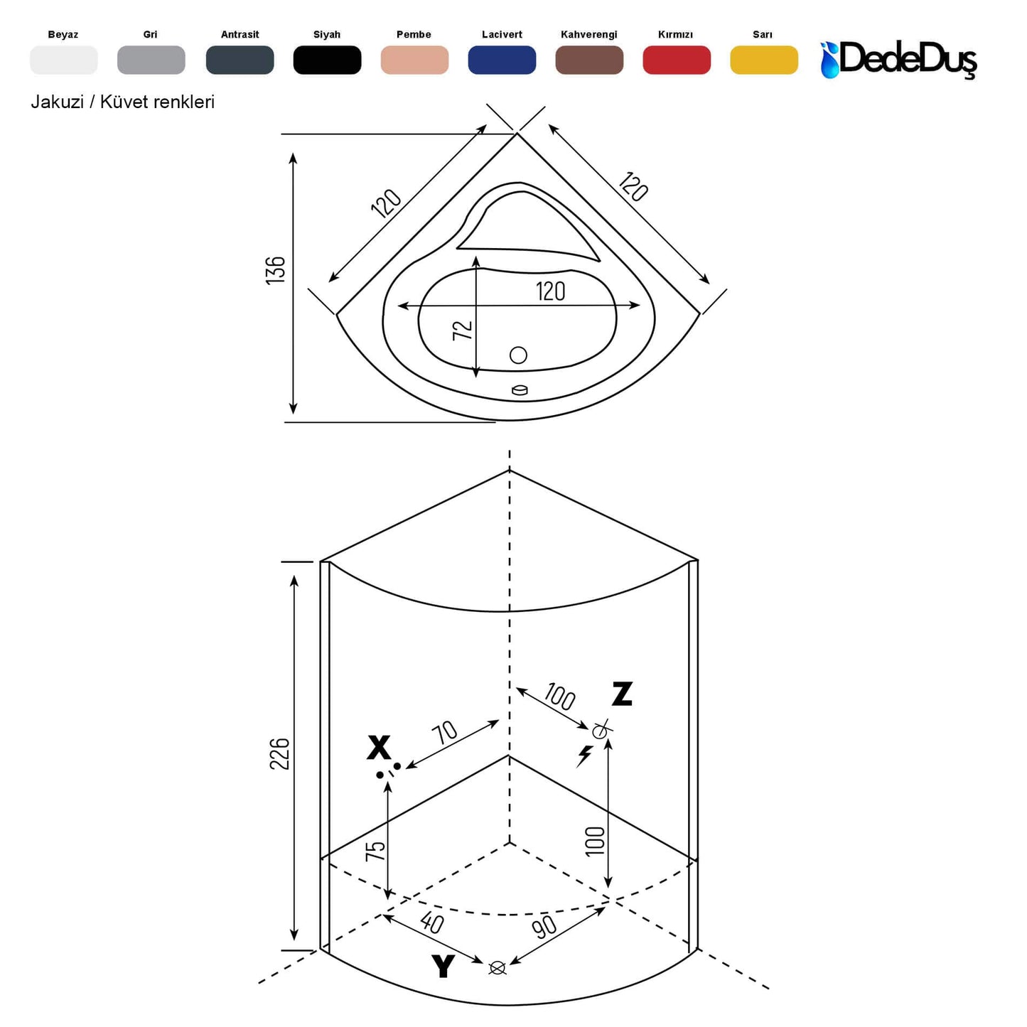 Kendinden renkli %100 Dökme Akrilik jakuzi küveti, Metal konstrüksiyon güçlendirme, Emiş süzgeci, Basınç ayar butonu, Kumandalı Sifon + System 1 Hidro Masaj Sistemi