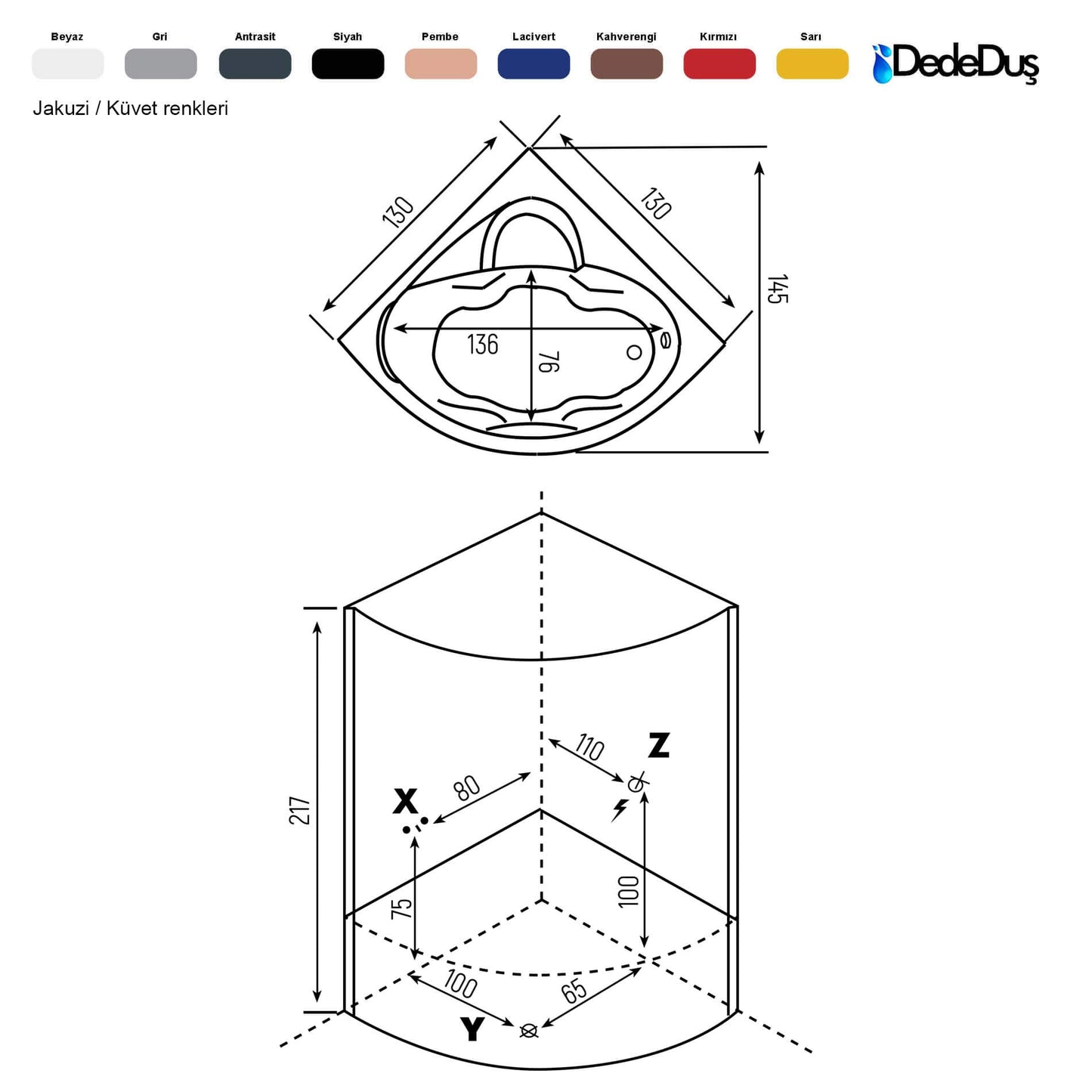 Kendinden renkli %100 Dökme Akrilik jakuzi küveti, Metal konstrüksiyon güçlendirme, Emiş süzgeci, Basınç ayar butonu, Kumandalı Sifon + System 1 Hidro Masaj Sistemi